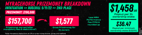 Once all mandatory deductions are removed, MyRacehorse will then receive a 12.5% performance fee on what is remaining. We are then left with the Net Prizemoney for owner distribution, if you own 0.01%, you will receive 0.01% of this pot, if you own a bigger stake i.e 1%, then you will receive 1% of the Net Prizemoney pot, and so on.