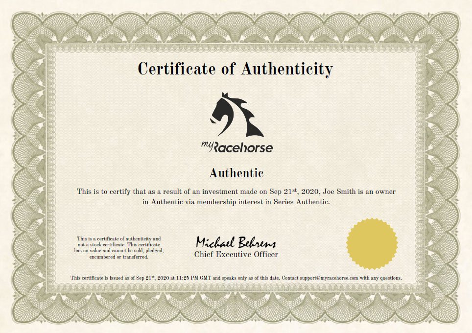We have a Certificate of Authenticity available for all MyRacehorse owners. This digital certificate can easily be printed from home, and includes the series name, your horse’s name, as well as the date the investment was originally made.